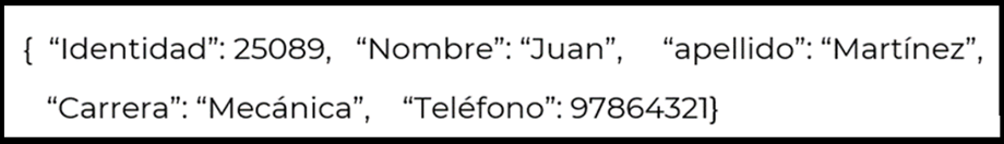 Cada elemento está formado por un par clave: valor, ejemplo “Identidad”: 25089.