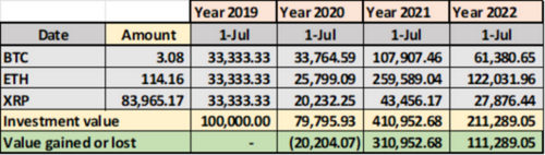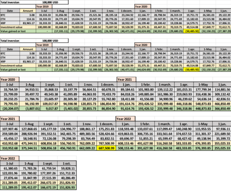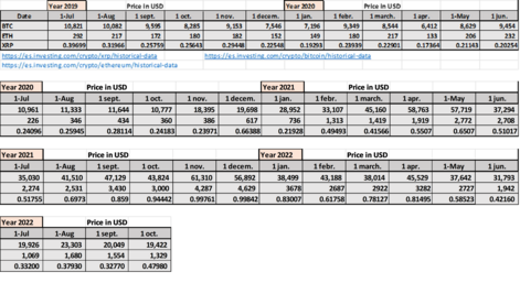 Al cumplir el tercer año (julio 2022), el valor de la inversión baja a 211,289 USD. Sim embargo los 33,333 USD del ETH se transformaron en 122,031 USD.