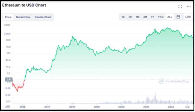 En el grafico siguiente observamos el comportamiento del ETH desde su inicio:
