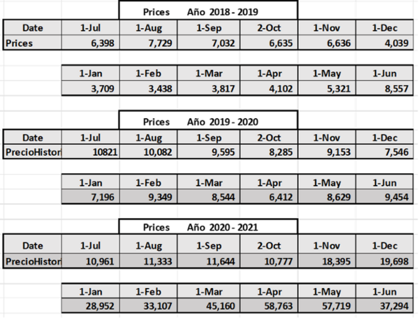 Tenemos los precios de Bitcoin en los años 2019, 2020 y 2021. Precios de apertura de BTC el primero de cada mes obtenidos del sitio Investing.com: